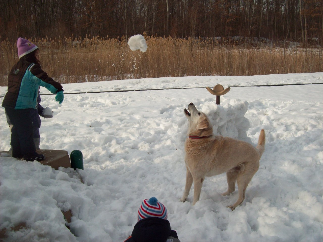 What does 45 degrees with snow on the ground mean? Great snowman making conditions. The kids, their friend Jordan, the dogs, and I put on our snow gear and walked to our neighborhood park where we spent the next two hours playing in the snow and on the playgound equipment. We all made a snowman together. Afterwards, Maya and Jordan worked dillengently on their walls for the snowball fight while Kai crafted a "trophy" out of snow. Benson even got involved in the snowball fight attempting to catch every snowball within reach.